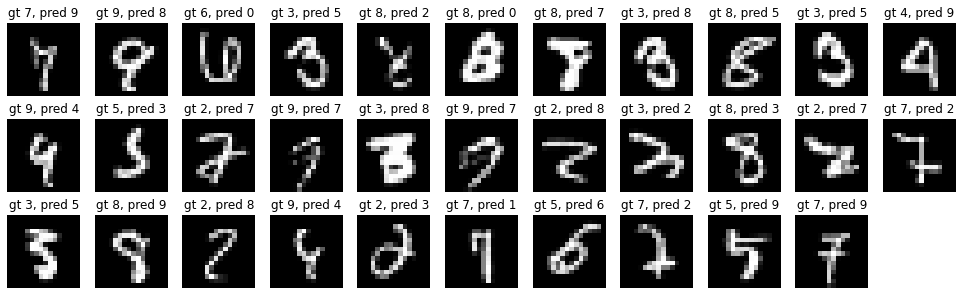 Which brings us down to only 32 / 2007 mistakes on the test set! I verified that just swapping tanh -> relu in the original network did not give substantial gains, so most of the improvement here is coming from the addition of dropout. In summary, if I time traveled to 1989 I’d be able to cut the rate of errors by about 60%, taking us from ~80 to ~30 mistakes, and an overall error rate of ~1.5% on the test set. This gain did not come completely free because we also almost 4X’d the training time, which would have increased the 1989 training time from 3 days to almost 12. But the inference latency would not have been impacted. The remaining errors are here: